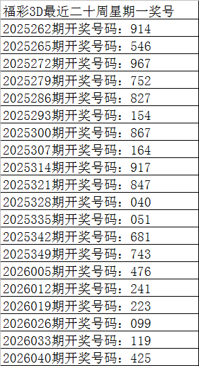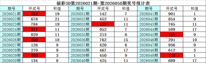 上期纪念:福彩3D第2026050期奖号为:689,其中奖号组选类型为:组六,奇偶比为1:2,大小比为3:0,012路比为2:0:1,和值为23,跨度为3。