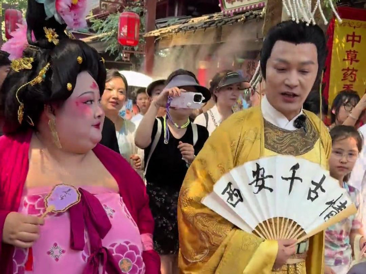 他每天王人要衣着近二十斤重的龙袍,在景区里上演泼水、互动,协作旅客拍照、直播打卡,一天要演八场,每场四十五分钟,一场王人不可落下。