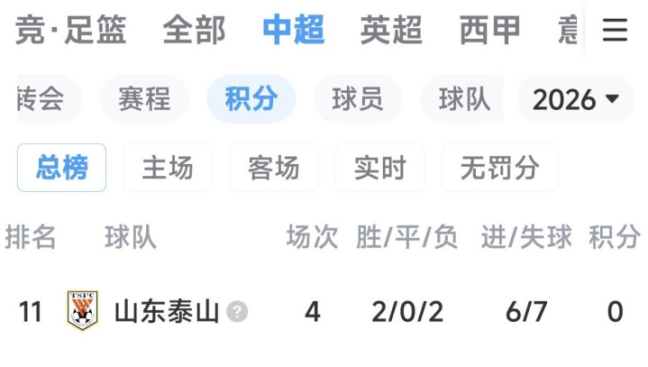 2026赛季(松手4月8日):4轮0分,排行第11位。原鲁能的资本基本破费殆尽。