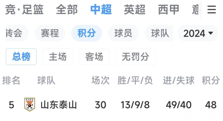 2024赛季:中超第5名;