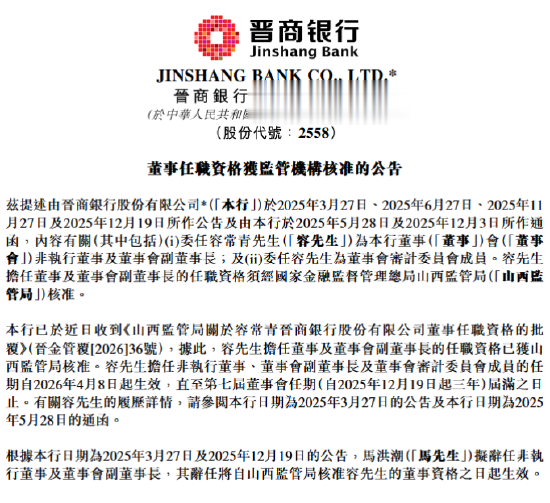 4月10日金融一线音书,晋商银行本日发布公告称,该行已于近日收到《山西监管局对于容常青晋商银行股份有限公司董事任职阅历的批复》(晋金管复[2026]36号),容常青担任董事及董事会副董事长的任职阅历已获山西监管局核准。容常青担任非实施董事、董事会副董事长及董事会审计委员会成员的任期自2026年4月8日起收效,直至第七届董事会任期(自2025年12月19日起三年)届满之日止。