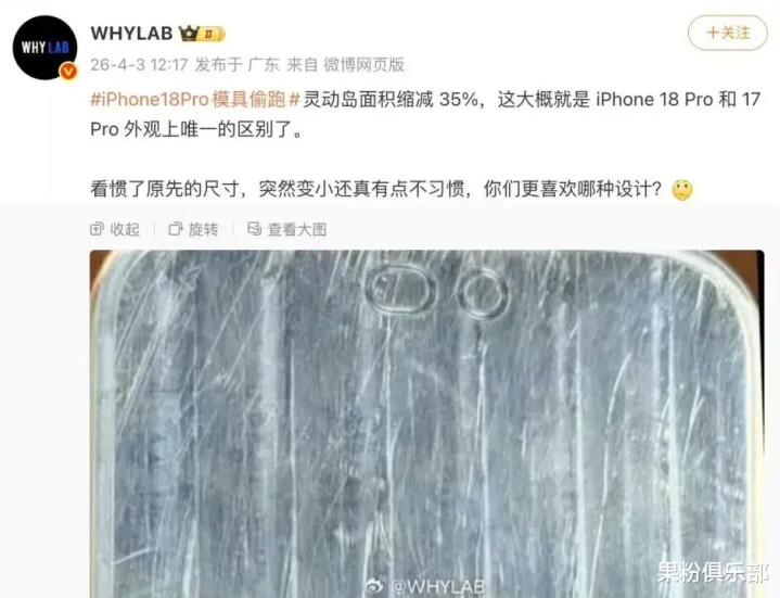 并配文「iPhone 18 Pro 将选择收缩版灵动岛」。