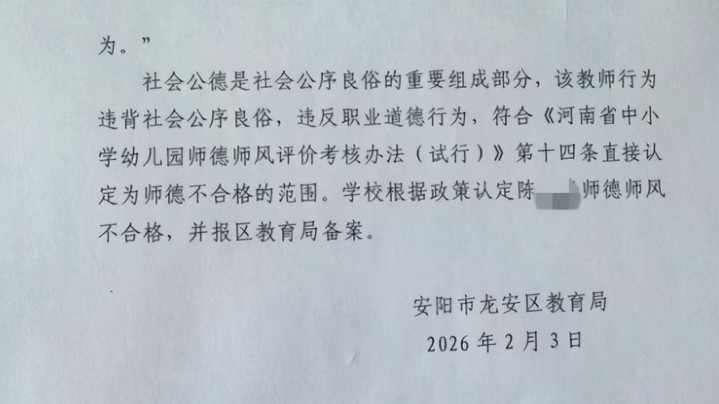 当地教育局称,认定陈某师德不合格,核心依据是当地纪检部门给予的Dang内警告处分,以及《河南省中小学幼儿园师德师风评价考核办法(试行)》的相关规定。该办法第十四条明确指出,教师若损害社会公共利益或违背社会公序良俗,当年师德师风考核结果可直接评定为不合格。