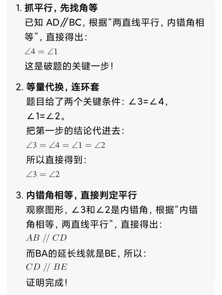 3. 逆向推导:从论断“CD∥BE”倒推,问孩子“要证这个,需要哪两个角高出?”,一步步结合。