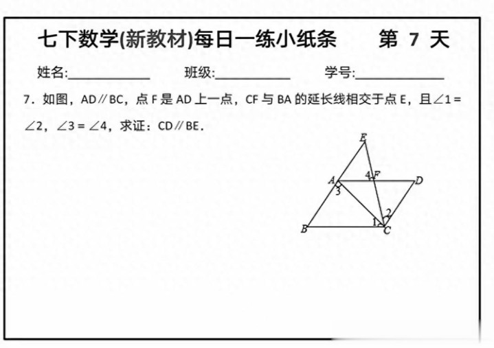 2. 圈画要求:让孩子用不同神情的笔,把“AD∥BC”“∠1=∠2”“∠3=∠4”圈出来,幸免漏看。