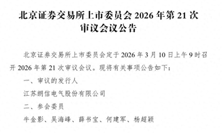 根据北交所安排,北交所将于3月10日召开2026年第21次审议会议,审议江苏朗信电气股份有限公司(以下简称“朗信电气”)首发事宜。