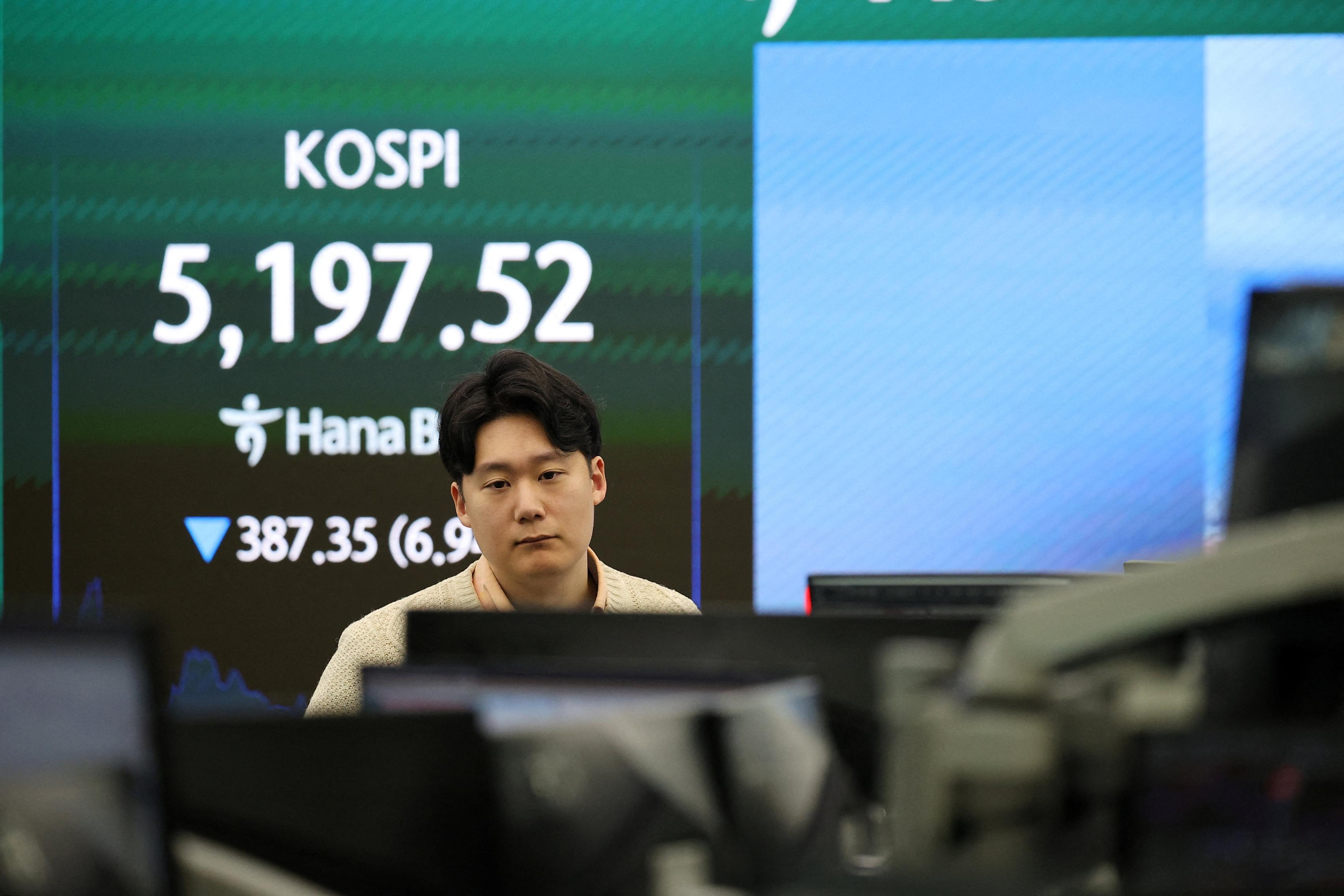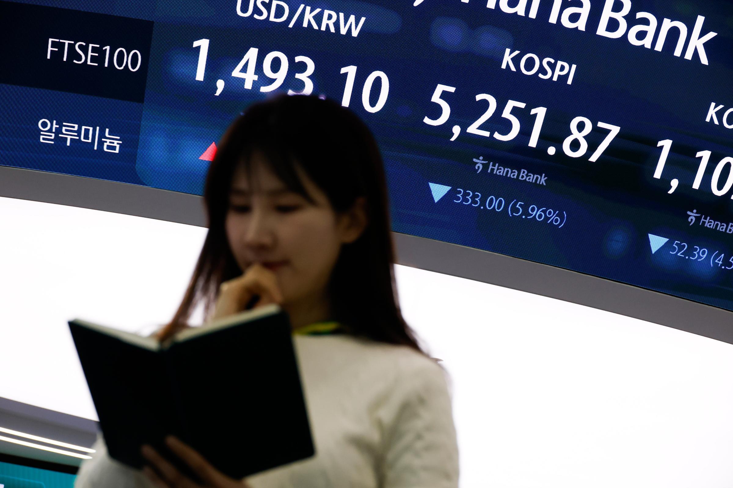 这是3月9日在韩国首尔一家银行拍摄的股指泄露屏。图源新华社
