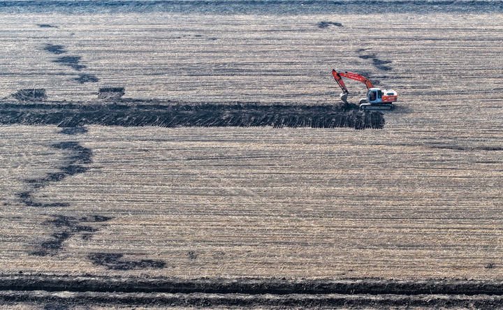 2025年3月11日,在天津市津南区八里台镇大韩庄村,工人驾驶挖掘机进行高标准农田施工作业(无人机照片)。新华社记者赵子硕摄