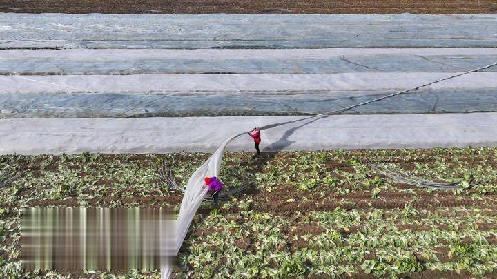 2025年12月11日,在山东省东营市广饶县李鹊镇,农民为作物覆盖防寒无纺布,应对寒潮(无人机照片)。新华社发(刘云杰摄)