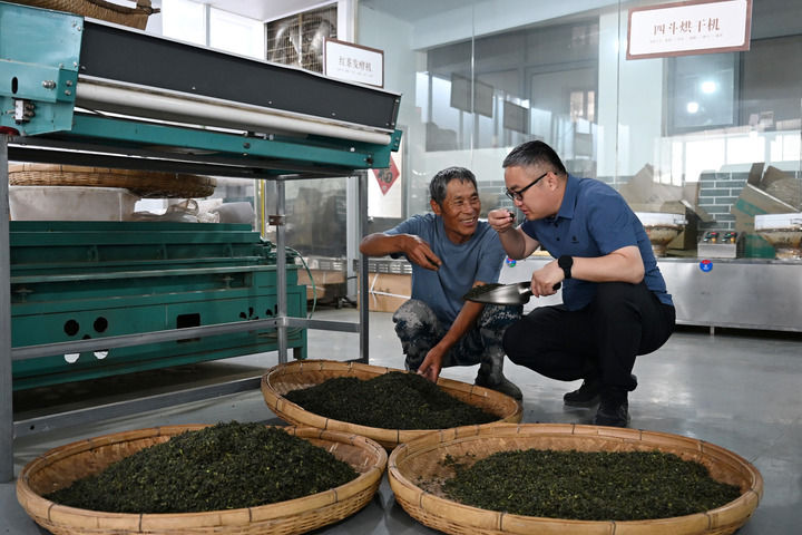 2025年5月25日,在山东省日照市五莲县丁家楼子村,第一书记郑勇山(右)在村里的茶叶合作社查看茶叶品质。新华社记者马宁摄